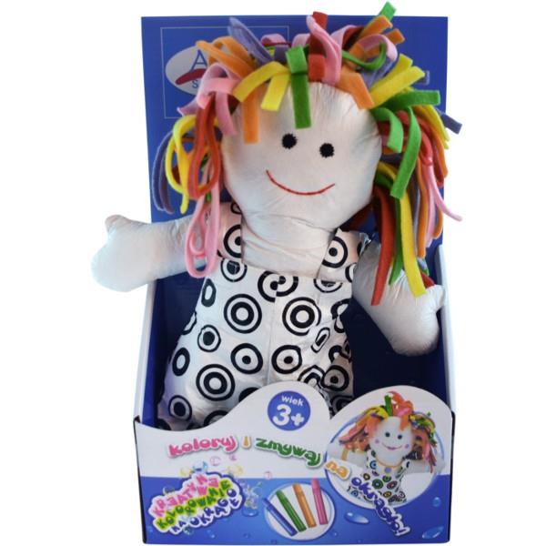 Dzięki specjalnym flamastrom i maskotkom zwykła kąpiel nabiera kolorów. Dosłownie i w przenośni. W skład tego zestawu wchodzi lalka-maskotka i 4 zmywalne flamastry. Na główce lalki znajdują się włosy stworzone z kolorowych paseczków. Ubranie maskotki jest ozdobione kółeczkami. Wewnątrz lalki znajduje się gąbka, można więc bez obawy wkładać ją do wody. Ale to nie koniec atrakcji. Maskotkę można pomalować za pomocą dołączonych do zestawu zmywalnych flamastrów, o intensywnych kolorach! Kolorować, tworzyć własne rysunki. Gdy jakiś wzór nam się znudzi, możemy go zmyć i zacząć zabawę od początku! ZAWARTOŚĆ: lalka-maskotka do kolorowania, 4 zmywalne flamastry (niebieski, zielony, pomarańczowy, różowy). UWAGI: Wymiary opakowania: 37,5x22x10 cm. Dla dzieci powyżej 3 roku życia.