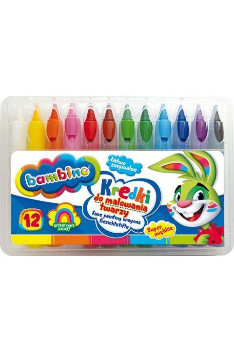 Kredki Bambino do malowania twarzy, 12 kolorówCechy produktu: super miękkie intensywne kolory łatwo zmywalne nietoksyczne idealnie sprawdzają się do malowania twarzy podczas eventów, zabaw urodzinowych, imprez karnawałowych czy sportowych plastikowa obudowa chroni dłonie przed zabrudzeniem