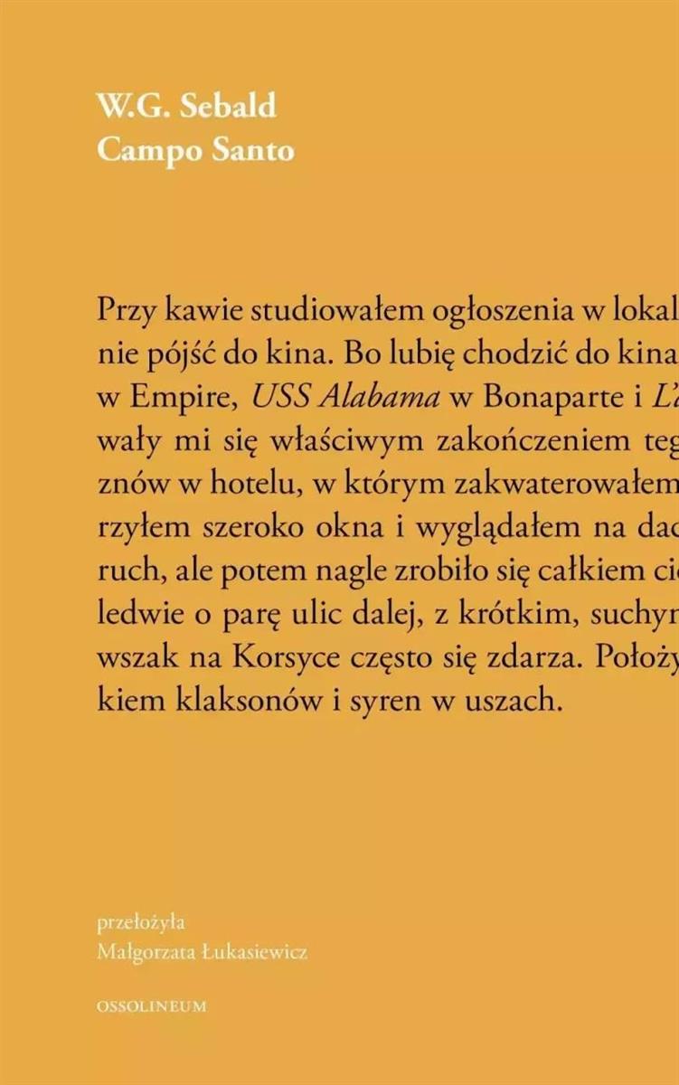 G. Sebalda: począwszy od prac literaturoznawczych, przez brawurową, wyzwoloną z gorsetu naukowości eseistykę, aż po niedającą się sklasyfikować gatunkowo prozę. Na tom składają się cztery utwory napisane do książki o Korsyce, która nigdy nie została ukończona, a także kilkanaście szkiców poświęconych postaciom takim jak Jean Amry, Bruce Chatwin, Peter Handke, Franz Kafka, Alexander Kluge czy Vladimir Nabokov. To nieciągła opowieść o narodzinach i dojrzewaniu Sebalda jako pisarza oddającego się refleksji nad funkcjonowaniem mechanizmów pamięci, rozmytą ontologią świata i upadkiem cywilizacji. Autora Campo Santo można wręcz uznać za inkarnację anioła historii, znanego z tekstu Waltera Benjamina: Tam, gdzie przed nami pojawia się łańcuch zdarzeń, on widzi jedną wieczną katastrofę.