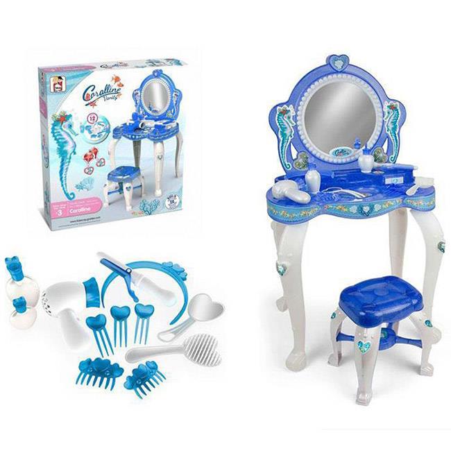 Toaletka Corraline 12 el. Śliczna niebieska toaletka dla minimalnej królewny, która ma wszystkie konieczne akcesoria do wystrojenia się równocześnie na bal jak i na urodziny do koleżanki. Gdy dziewczynka usiądzie na znikomym niebieskim stołeczku będzie miała wszystko pod ręką.