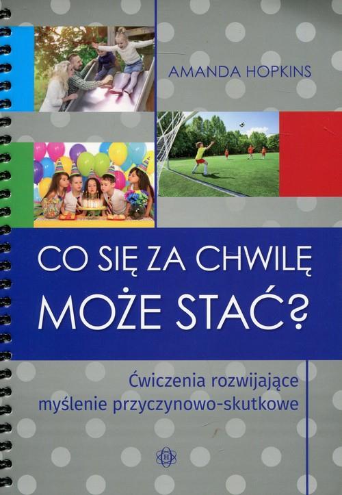 Co się za chwilę może stać? to książka, która uczy dostrzegać i analizować zależności przyczynowo-skutkowe. Patrząc na zdjęcia i odpowiadając na pytania, dziecko musi przewidzieć, co się stanie w danych sytuacjach. W książce przedstawiono 57 zdjęć. Na stronach parzystych umieszczono fotografie dla dziecka. Na stronach nieparzystych znajdują się pytania i polecenia, które czyta dorosły (nauczyciel, terapeuta, rodzic) pracujący z uczniem.