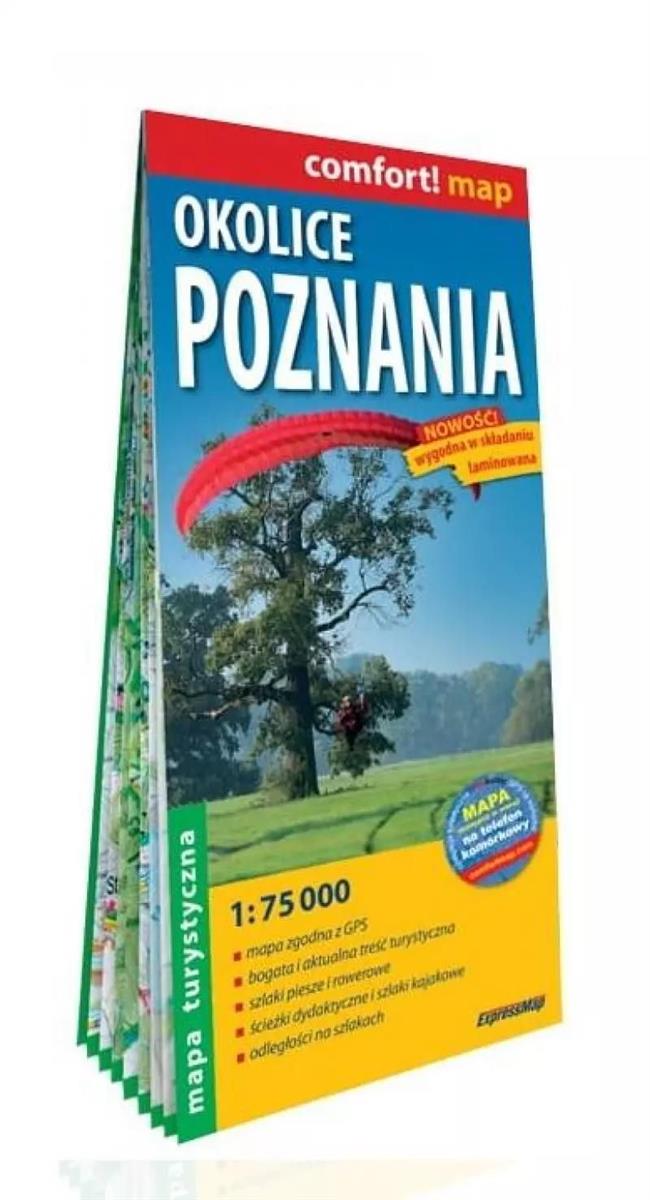 Dwustronnie laminowana, wygodna w składaniu mapa turystyczna okolic Poznania powstała we współpracy z krajoznawcami z regionu. Została wykonana w dogodnej zarówno dla pieszego, jak i rowerzysty skali 1:75 000 (1 cm 750 m) i jest zgodna z GPS (współrzędne geograficzne w układzie WGS-84).