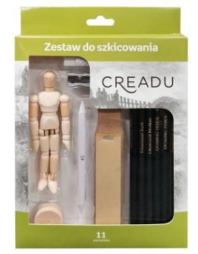 zestaw do szkicowania marka Craedu zestaw zawiera: drewnianego manekina, 3 ołówki 2B 3B 4B, 3 ołówki węglowe, 1 temperówkę aluminiową, 1 gumkę do ścierania, blok papieru ściernego pakowane na blistrze