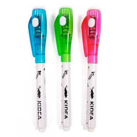Magiczny długopis z lampką LED posiada tusz widoczny tylko w świetle wbudowanej latarki UV. Tusz podczas pisania jest niewidoczny, aby przeczytać niewidzialną wiadomość należy podświetlic kartkę. To świetna zabawa w ukrywanie informacji przed niepożądanymi osobami i idealny sposób by strzec swoich sekretów. Zasilanie na baterie.