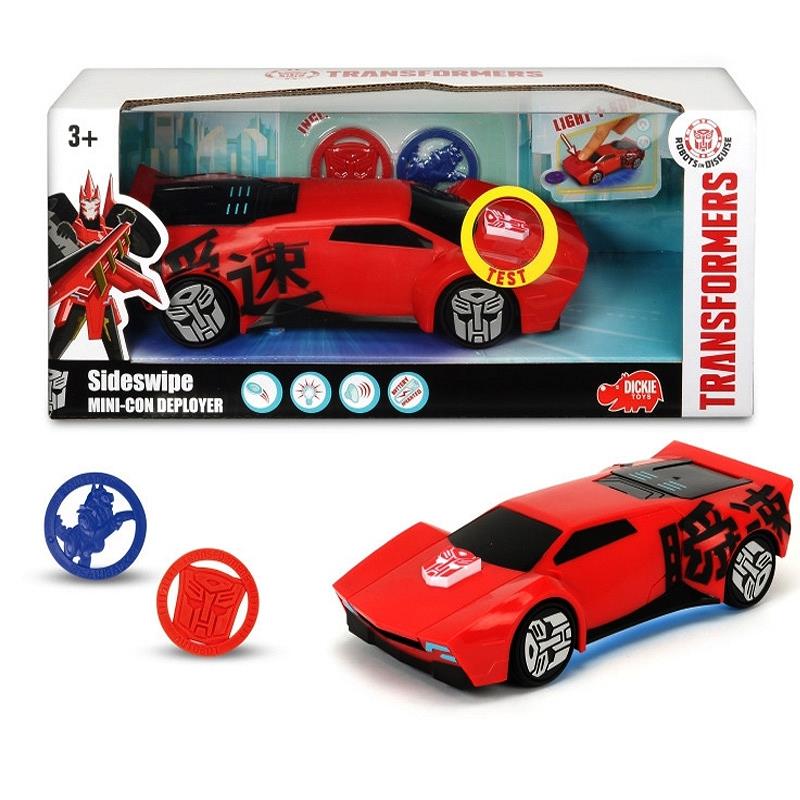 Transformers Wyrzutnik krążków Sideswipe 3114004 należy do kolekcji pojazdów firmy Dickie na licencji Hasbro Transformers. Auto wyposażono w funkcje, które dodają zabawie dodatkowych atrakcji i emocji. Samochód nie podlega transformacji.