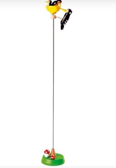 Zabawka firmy Goki to interesująca propozycja dla każdego ciekawskiego dziecka. Dzięki swojej formie mały odkrywca może obserwować jak porusza się dzięcioł przy stukaniu i pukaniu w korę drzewa. Zabawka składa się z drewnianej podstawy i metalowego pręciku, który od góry zakończony jest żółtym gniazdem z mały pisklętami. Na metalowym pręciku znajduje się dzięcioł na sprężynce. Po przesunięciu go w górę ptaszek powoli spada i dzięki sprężynie, trzęsąc się uderza dzióbkiem w drzewo, zupełnie jak prawdziwy dzięcioł.