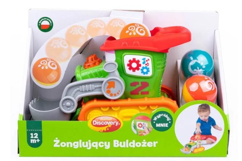 Zabawie towarzyszy piosenka w języku polskim.Żonglujący Buldożer przeznaczony jest dla dzieci od 12 miesiąca życia. Cechy zabawki: zabawka mówi po polsku piosenka w języku polskim rączka do prowadzenia prowadź pojazd do przodu i do tyłu, aby żonglował piłeczkami migające światełkoW zestawie znajdują się piłeczkiProdukt może mieć uszkodzone opakowanie lub naruszoną plombę fabryczną opakowania.