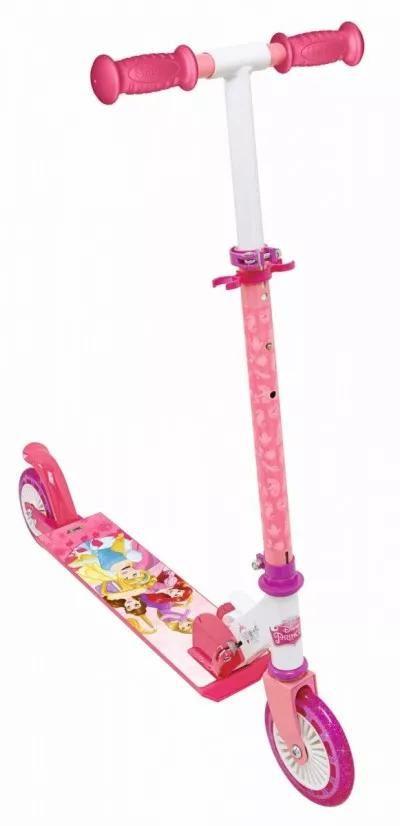 Hulajnoga na dwóch kółkach regulowana wysokość kierownicy ciche kółka łatwa do złożenia z hamulcem konstrukcja metalowo-aluminiowa Ozdobiona motywem z bajek o Ksiżniczkach Disneya Wymiary produktu: 70 x 32 x 83 cm Wymiary opakowania: 22 x 10 x 635 cm Maksymalne obciążenie: 50kg Dla dzieci w wieku: 5+