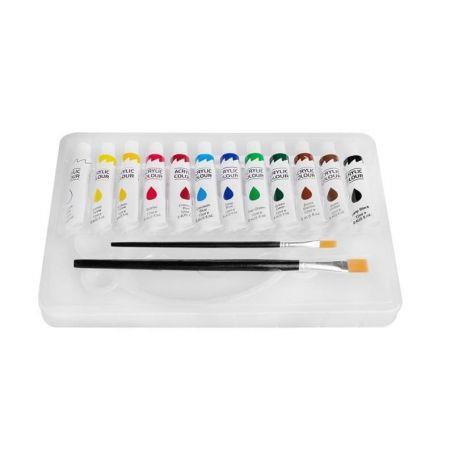 W zestawie:- farby akrylowe (12 tubek),- 2 pędzelki,- tacka do mieszania kolorów.