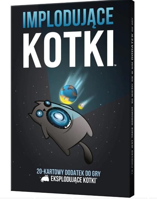 Eksplodujące Kotki: Implodujące kotki (nowa edycja). Dodatek do gry Eksplodujące KotkiZupełnie nowe karty, zupełnie nowe żarty, jeszcze więcej wybuchów i dodatkowy, szósty gracz przy stole! To i jeszcze więcej znajdziecie w tym niepozornym pudełeczku, które stanowi dodatek do puchatej rosyjskiej ruletki Eksplodujących Kotków. Wraz z rozszerzeniem do gry dołącza nowy rodzaj karty Implodujący Kotek. Gdy pociągniesz go z talii, nie wybucha od razu! Zamiast tego umieszczasz go w wybranym przez siebie miejscu talii ODKRYTEGO, więc od tej pory będzie wiadomo, gdzie się znajduje. Gracz, który będzie musiał go dobrać, będzie w nie lada opałach, bo na Implodującego Kotka nie działa karta rozbrojenia.