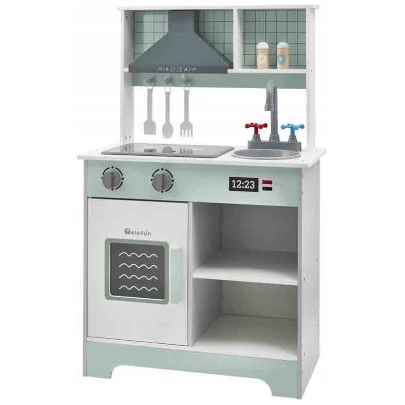 Wielofunkcyjna drewniana kuchenka z bogatym wyposażeniem sprawdzi się doskonale w kulinarnych eksperymentach małego kucharza.