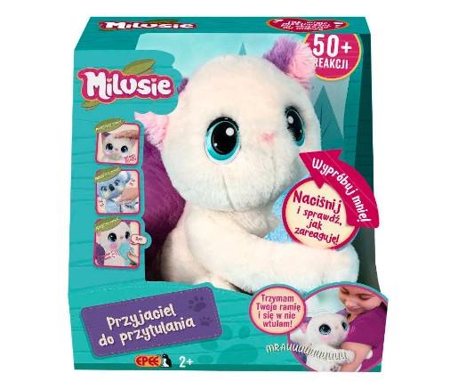 Milusie to niezwykli, pluszowi przyjaciele. Chwytają ramię dziecka łapkami, przytulają się i poruszają główką, zupełnie jak prawdziwe zwierzątka. Wydają zabawne dźwięki, a ich policzki rozświetlają się wieloma kolorami. Oferują ponad 50 różnych reakcji.