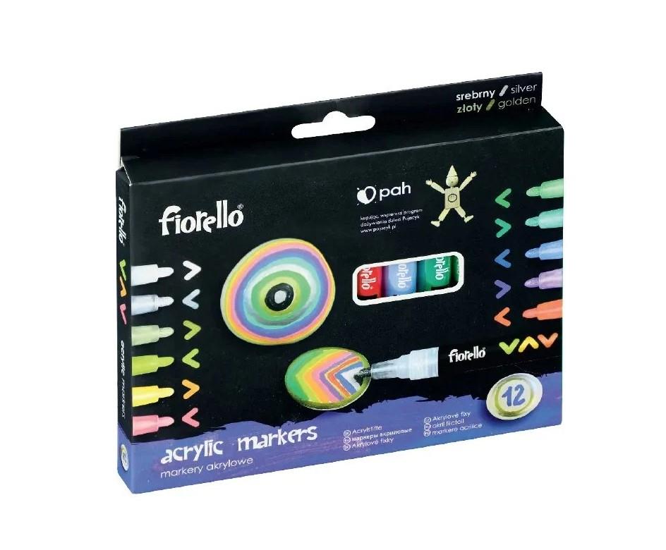 Fiorello, Markery akrylowe 12 kolorów szybkoschnący tusz na bazie wody kryjące, intensywne kolory przeznaczone do wielu powierzchni, jak karton, drewno, ceramika, tynk, tkanina, skóra. można ozdabiać nimi torebki, buty, pokrowce na telefon, kamienie i inne dla artystów i amatorów. kolor złoty i srebrny w zestawie grubość linii pisania: 2 mm