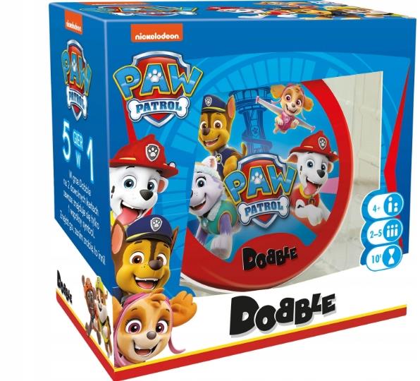 GRA DOBBLE GRA KARCIANA PSI PATROLDobble Psi Patrol Marshall, Rubble, Chase, Rocky, Zuma, Skye! Bohaterskie psiaki, które na co dzień dzielnie pomagają potrzebującym, zawitały na karty Dobble, by wspierać najmłodszych w ćwiczeniu refleksu i spostrzegawczości! Zadanie jest proste: spójrz na pierwszą kartę, którą trzymasz w ręku oraz na tę, która leży na środku stołu. Znajdź na nich wspólny symbol, nazwij go i szybko pozbądź się swojej karty.