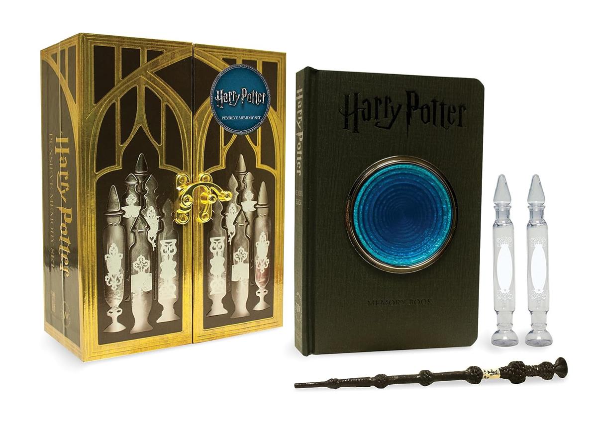 Cherish memories of the Harry Potter films and your own with this one-of-a-kind pensieve set inspired by the one seen in Dumbledore s Hogwarts office, featuring a journal with embedded pensieve, Dumbledore?s wand pen, two memory vials, and keepsake deluxe gold box, perfect for display. Specifications: A 7 x 3 1/2 x 9 inch deluxe box set featuring a journal, wand pen, and two memory vials Pensieve Journal: Includes a 5-1/4 x 8 inch deluxe 176 page journal with pensieve dish embedded into the cover; it features quotes from the Harry Potter films throughout and space to write in your own memories Professor Dumbledore?s Elder Wand Pen: Includes a finely detailed 8 inch Dumbledore, also known as the Elder, wand pen, perfect for writing down your memories in the pensieve journal Memory Vials: Two 4 inch vinyl memory vials with removable lids, fashioned after those seen in the films Keepsake, Deluxe Packaging: This ultra-deluxe gold flecked box comes with flocked lining and opens up like a trifold, perfect for displaying your pensieve; also includes a gold closing latch for safe keeping and storage Perfect Gift: A perfect gift or self-purchase for Harry Potter fans Officially licensed: Authentic Harry Potter collectible