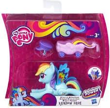 Zestaw z serii Latające Kucyki zawiera Rainbow Dash z ruchomymi nóżkami pędzącą na pokaz. Do zestawu dołączony jest różowy wózeczek, który kucyk może ciągnąć szybując w powietrzu, czapeczka na przyjęcie oraz skrzydła, które umocowane na plecach Pinkie Pie ruszają się gdy kucyk jest w ruchu. Pięknie opakowany zestaw jest idealnym prezentem dla lubiącej kucykowe przygody dziewczynki.