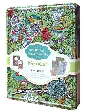 Niezwykle piękna, trwała puszka skrywa 2 bloki z antystresowymi kolorowankami, 2 plansze z antystresowymi kolorowankami oraz zestaw ołówkowych kredek. `Kreacja` jest zbiorem niezwykłych rysunków, linii, z których wyłania się tajemniczy kształt, ciekawe zwierzę lub roślina. Kolorowanie służy więc relaksowi, a kształty pobudzają wyobraźnię.