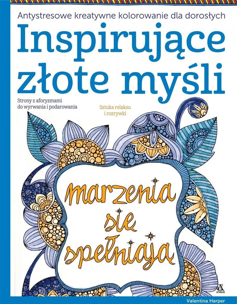 Strony z aforyzmami do wyrwania i podarowaniaPokoloruj swoje marzenia. Podążaj za nimi swoim sercem.Życie to cudowna przygoda i wszystkie marzenia mogą się spełnić! Pamiętaj o nich, kolorując Inspirujące złote myśli, gdzie na każdej stronie znajdziesz nadzieję i pokrzepienie.