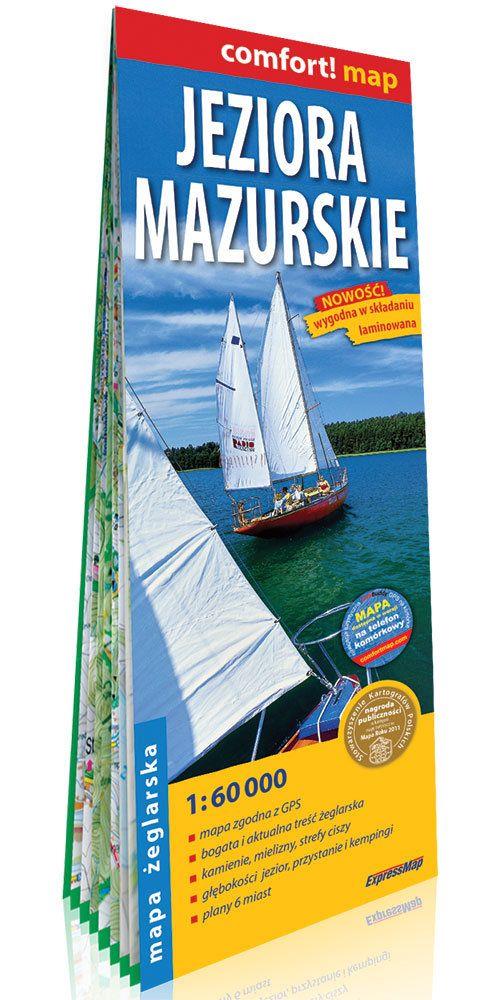 Żeglarska mapa Krainy Wielkich Jezior Mazurskich jest dwustronnie laminowana, trwała i wodoodporna, dzięki czemu sprawdzi się w każdych warunkach, zarówno na łódce, na jachcie, jak i na lądzie. Poza bogatą treścią żeglarską zawiera też treść turystyczną. Dodatkowo plany Węgorzewa, Giżycka, Pisza, Mikołajek, Rucianego-Nidy i Rynu w skali 1:15 000.Na mapie m.in.:śluzy, przystanie i pomosty, przeszkody i mielizny, slipy i dźwigi, warsztaty szkutnicze i żaglomistrzowskie, wypożyczalnie sprzętu wodnego, stacje benzynowe dla jachtów,strefy ciszy, zakazy przybijania do brzegu,szlaki piesze i kajakowe, linie żeglugi pasażerskiej,baza noclegowa, m.in. stanice wodne, kempingi, schroniska młodzieżowe, hotele, obiekty zabytkowe i rezerwaty przyrody,izobaty pokazujące głębokości jezior (izobaty wrysowane są co 10 m, dodatkowo pokazane są bardzo istotne dla żeglarzy izobaty 1, 2 i 5 m), uzupełnieniem których jest barwna batymetria.