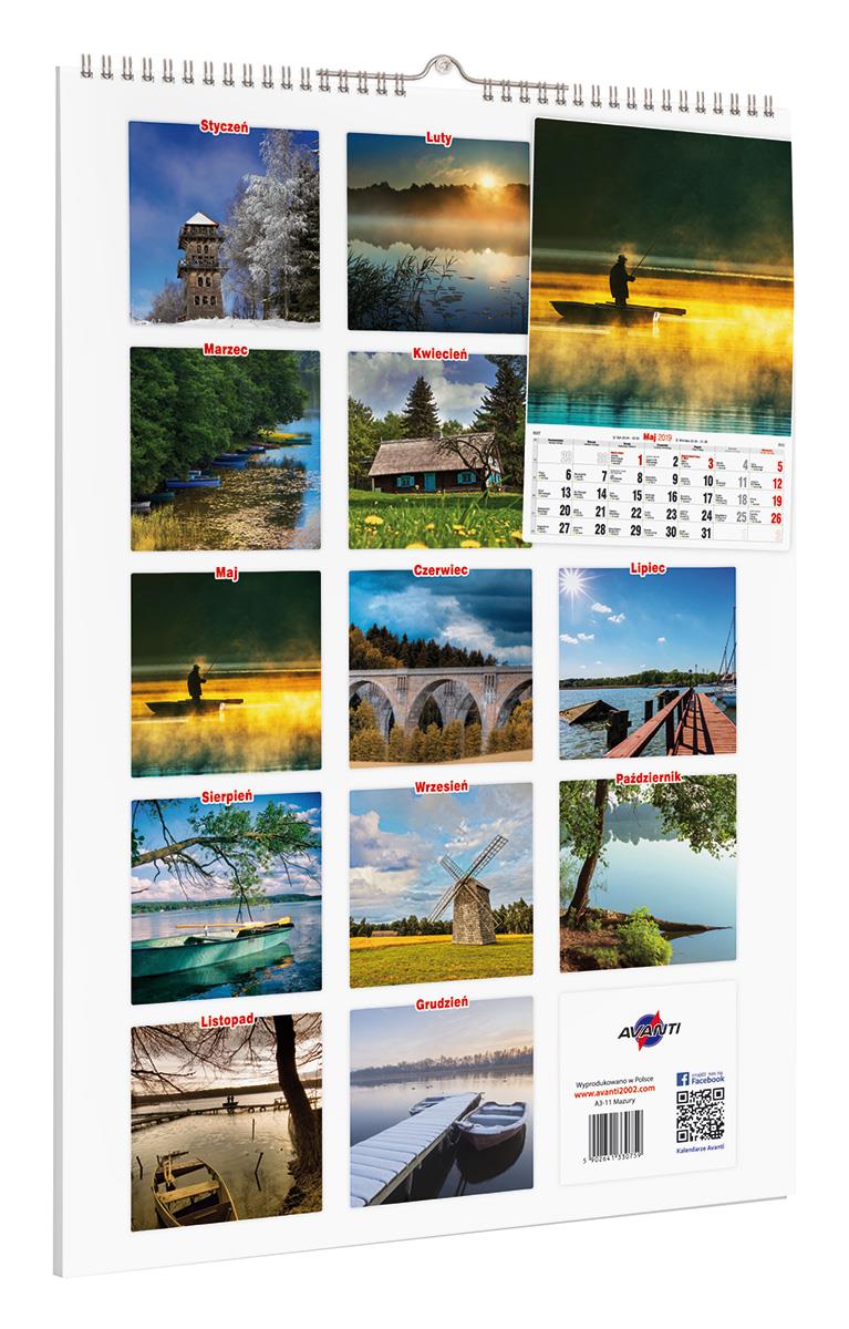 Duży kalendarz ścienny, drukowany na grubym papierze powlekanym.