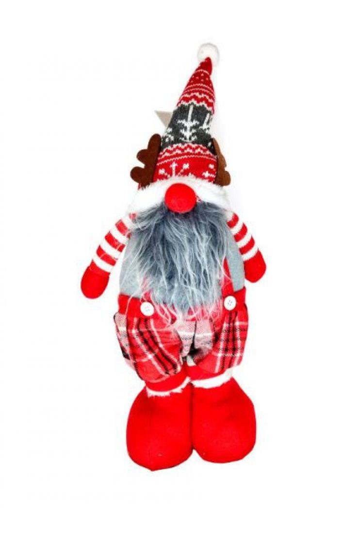 Świąteczny krasnal z długimi nogami. Ma nasuniętą na głowę dużą, spiczastą czapkę ze świątecznym wzorem, z której wystaje jedynie nos i długa broda. Krasnal stoi stabilnie dzięki dużym, cięższym bucikom. Posiada miękkie wypełnienie.