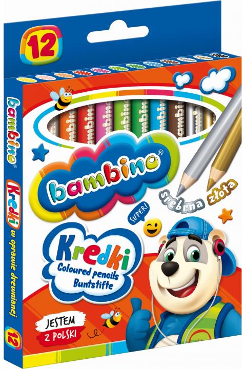Kredki BAMBINO w oprawie drewnianej bez temperówki, 12 kolorówCechy produktu: wykonane z glinki kaolinowej w drewnianej oprawie produkowane w Polsce łatwe do temperowania miękkie w użyciu intensywne i nasycone kolory doskonale kryją powierzchnię idealne do rysowania, wypełniania dużych płaszczyzn i wykonywania miękkich przejść pomiędzy kolorami grube, odpowiednio wyważone, przez co idealnie dopasowują się do małej dłoni dziecka odpowiednie dla dzieci 3+ spełniają wymagania zasadnicze dyrektywy Parlamentu Europejskiego i Rady 2009/48/WE z dnia 18 czerwca 2009 w sprawie bezpieczeństwa zabawek oraz wymogi odpowiednich norm zharmonizowanych 12 kolorów w zestawie złota i srebrna kredka