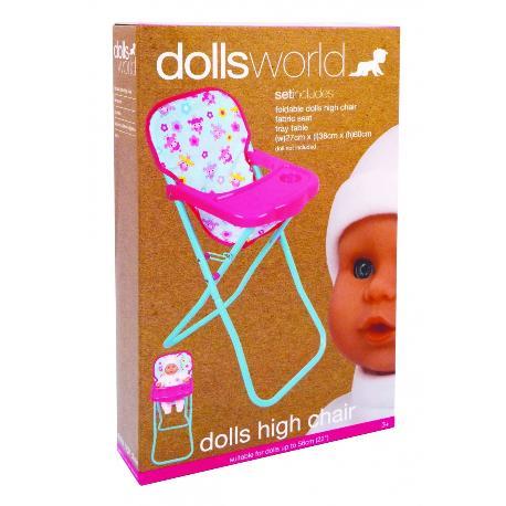 DOLLS WORLD KRZESEŁKO DO KARMIENIA DLA LALKI to idealne uzupełnienie zabawy lalką Dolls World. Stelaż krzesełka wykonany jest z metalowych rurek, stolik z wytrzymałego plastiku, zaś siedzisko z materiału. Wymiary krzesełka po złożeniu 27x38x60cm.