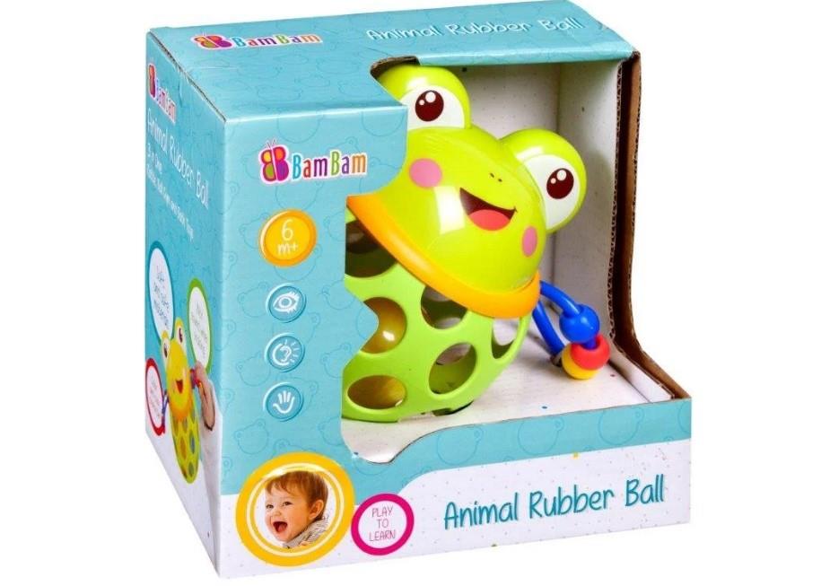 wykonana z miękkiej i plastycznej gumy wyposażona w grzechotkę Żabki regulowane otwory pozwalają małym rączkom na chwytanie, ugniatanie, turlanie oraz potrząsanie, wydając przy tym efekty dźwiękowe faktura i właściwości materiału, z jakiego została wykonana, pozwalają powracać do pierwotnego kształtu boczne uchwyty z kolorowymi obręczami wpływa na rozwój słuchu i wzroku wspiera zdolności manulne