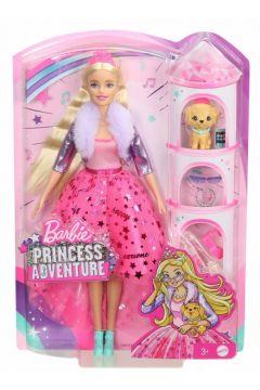 Lalka Księżniczka Barbie jest ubrana po królewsku: w różowy top oraz asymetryczną warstwową spódniczkę z uroczymi błyszczącymi grafikami. Krótka kurtka o metalicznym odcieniu z „futrzanym” kołnierzem nadaje stylizacji blasku, a niebieskie buciki sportowe to kolejny wesoły akcent kolorystyczny. Stylowe akcesoria – takie jak tiara, dodatkowa para butów, okulary przeciwsłoneczne, torebka, naszyjnik i „smartfon” – dodają szyku każdej bajkowej historyjce ze świata Barbie. Żadna królewska przygoda nie byłaby kompletna bez pupila – szczeniaczek wygląda wyjątkowo uroczo w swojej własnej tiarze i naszyjniku! Dzięki lalkom zainspirowanym filmem „Barbie Princess Adventure Przygody Księżniczek” dzieci mogą odgrywać przeróżne scenki.