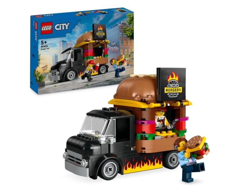 Zestaw LEGO? City Ciężarówka z burgerami (60404) dla pięciolatków i starszych dzieci pobudzi ich wyobraźnię. Mobilny fast food z wielkim burgerem na dachu można odczepić od ciężarówki. W zestawie jest także szczegółowa kuchnia, składniki i okienko, które otwiera się, ukazując znak z grillowanym burgerem. Całości dopełniają minifigurki sprzedawcy i klienta z aparatem słuchowym.