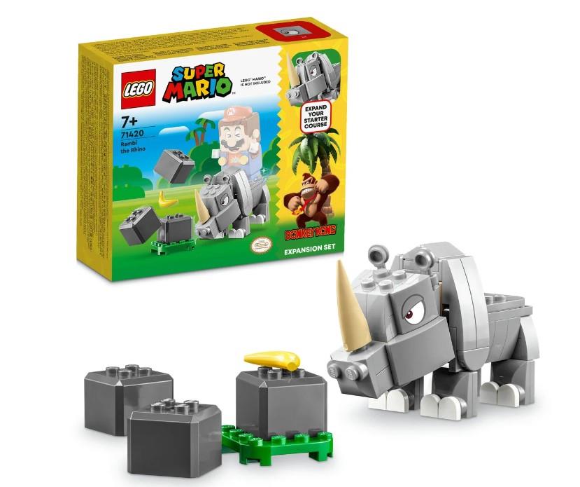 Przygotuj się na przygody z LEGO? Super Mario? dzięki zestawowi Nosorożec Rambi ? zestaw rozszerzający (71420) dla dzieci w wieku od siedmiu lat. Zawiera on zbudowaną z klocków figurkę LEGO Rambiego, na której mogą jeździć interaktywne figurki LEGO? Mario?, LEGO? Luigi? lub LEGO? Peach? (brak w zestawie). Kiedy Rambi chodzi, szarżuje na dołączone skalne elementy, które można układać jeden na drugim, i wykonuje inne ruchy, na interaktywnej figurce włączają się efekty dźwiękowe. Uwaga: do gry interaktywnej wymagany jest zestaw startowy 71360, 71387 lub 71403.