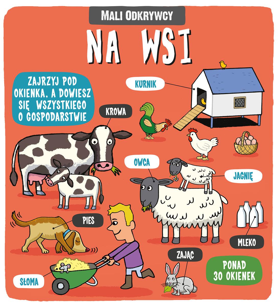 Seria Mali odkrywcy została stworzona z myślą o najmłodszych czytelnikach ciekawych świata. Pod otwieranymi okienkami kryją się ciekawostki związane z danym tematem. Nowoczesna grafika i przejrzysty układ treści wspomagają naukę poprzez zabawę.Książeczka Na wsi zawiera rysunki zwierząt, miejsc, a także podstawowego wyposażenia gospodarstwa.
