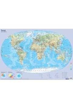 Świat - mapa ścienna w skali 1 : 60 000 000 - fizyczno-polityczna. Przejrzystemu obrazowi ukształtowania lądów i oceanów towarzyszą takie elementy treści jak: główna sieć rzeczna i najważniejsze jeziora, opisy ważniejszych krain geograficznych, wysp, półwyspów, mórz, basenów i grzbietów oceanicznych. Stolice państw oraz wielkie miasta, a także granice krajów i terytoriów zależnych dopełniają obraz współczesnego świata.