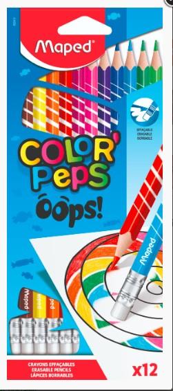 Kredki ścieralne Color& 39;Peps OOPS z białą gumką. Wykonane z żywicy syntetycznej co wpływa na jakość korpusu - jest elastyczny i giętki. Trójkątny, ergonomiczny przekrój zapewnia poprawny chwyt. Łatwe do temperowania - nie strzepią się i nie zostawiają drzazg. Wzmocniony grafit o przekroju 2,9 mm jest odporny na kruszenie oraz łamanie i doskonale się. Intensywne, nasycone kolory. Wyprodukowane zgodnie z wszystkimi regulacjami dotyczącymi produktów dla dzieci. 12 sztuk pakowane w praktyczne, kartonowe etui. JS. 1 etui.