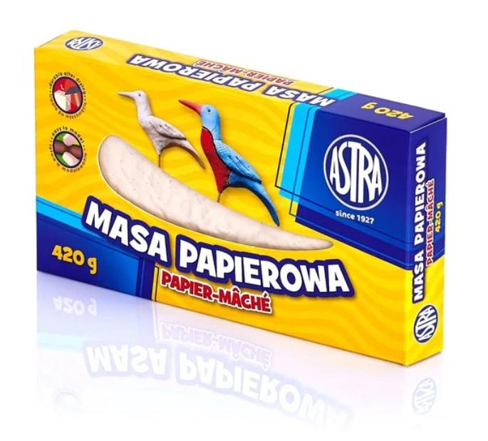 Masa papierowa Astra 420g. Masa papierowa Astra z materiału plastycznego o konsystencji gotowego ciasta do tworzenia małych form lub prac na konstrukcjach. Masa dobrze przywiera do innych materiałów, po wyschnięciu materiał można rzeźbić, szlifować i malować.