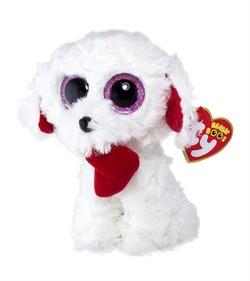 Słodki piesek , wymiar około 15 cm, z czerwonym sercem w ustach, duże oczy.