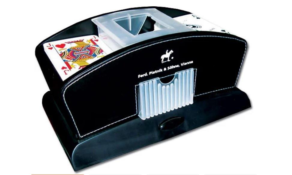 Automatyczna maszynka do tasowania kart. Wystarczy wcisnąć guzik, by talia została potasowana. To urządzenie potasuje za ciebie 2 talie kart. Po włożeniu podzielonej na dwie części talii (lub dwóch) po obu stronach wlotów następuje tasowanie. Potasowane karty pojawiają się w trzecim wylocie, a praktyczna tacka ułatwia odbieranie potasowanych kart.