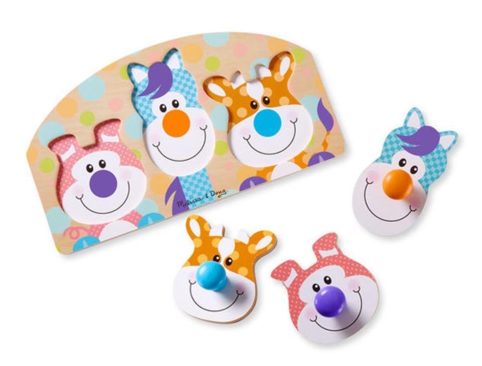 Małe rączki i wielka wyobraźnia pokochają te przyjazne drewniane zwierzęta gospodarskie z dużymi nosami! Uśmiechnięty świnka, koń i krowa mają drewniane gałki na nosy, które są łatwe do uchwycenia. Niemowlęta i małe dzieci będą zachwycone dopasowywaniem elementów do obrazków na solidnej drewnianej planszy z puzzlami o wymiarach 35 x 20 cm, odkrywając kolory i wzory oraz rozwijając umiejętności motoryczne. Puzzle i zabawki First Play mają jasne kolory, odważne wzory i kapryśne projekty, które poprawiają umiejętności, pobudzając wyobraźnię i zachwyt - od samego początku! Wiek: 12 mies.+ Płeć: chłopiec, dziewczynka.