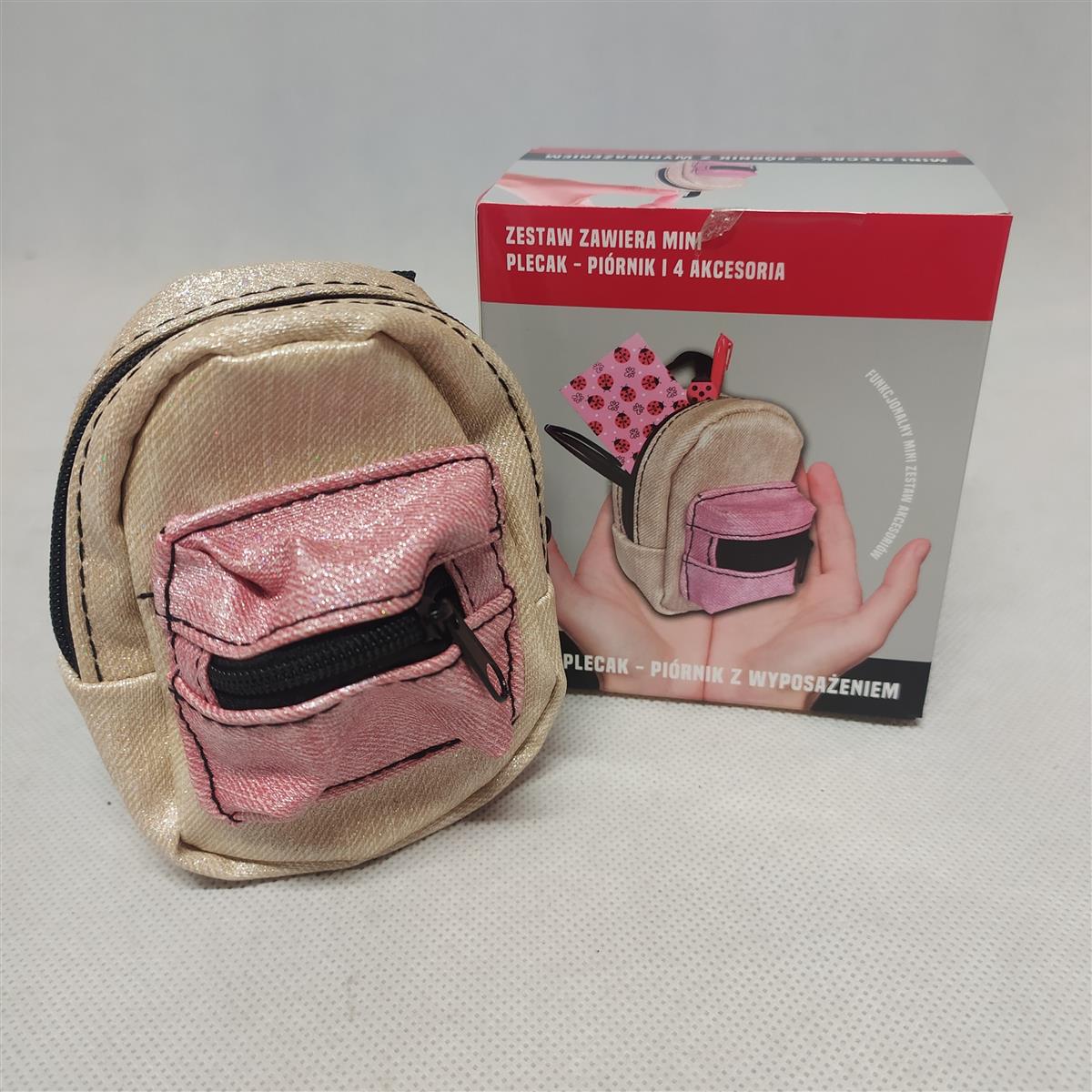 Zestaw zawiera mini plecak - piórnik i 4 akcesoria, kolor beżowo-różowy z brokatem.
