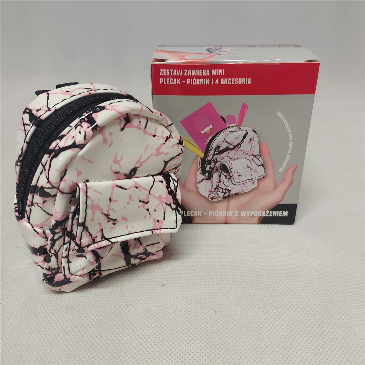 Zestaw zawiera mini plecak - piórnik i 4 akcesoria, kolor biało-czarno-różowy.