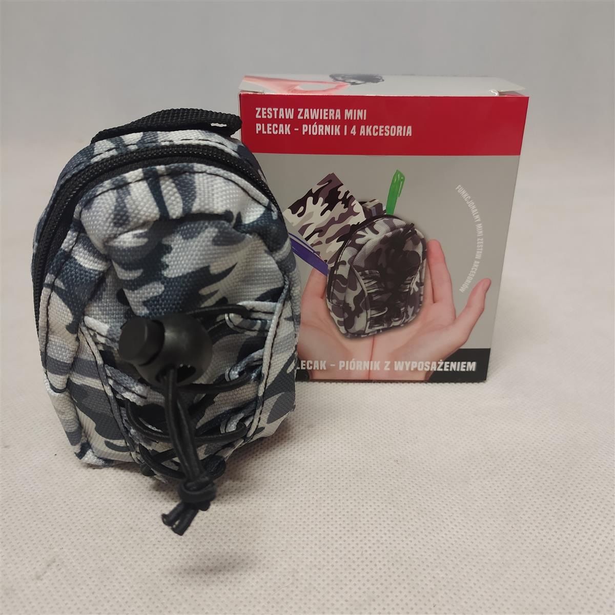 Zestaw zawiera mini plecak - piórnik i 4 akcesoria, kolor szare moro.