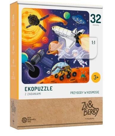 PRZYGODY W KOSMOSIE 3+Ekopuzzle z zadaniami32-elementowy zestaw puzzli ukazujący dwoje dzielnych, młodych astronautów w kosmosie. Puzzle wyróżniają się zaczepami w kształcie główek surykatki Zu i alpaki Berry i tekturowymi figurkami tych zwierzaków. W załączonym do puzzli poradniku znajdziemy pytania o różnym poziomie trudności odnoszące się do ilustracji i zainspirowane nią. Dodatkowo dajemy drugie życie pudełku! Wnętrze można pokolorować, a po jego rozłożeniu ukazują się historie dotyczące bohaterów serii.