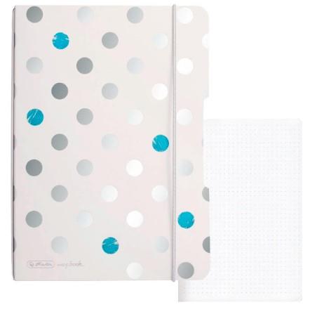 Book Flex Frozen Glam z wkładem w kropki Notes z białą okładką, ozdobioną wtłoczonymi kropkami w metalicznym kolorze srebrnym i niebieskim. Mocowane na srebrnej gumce, która pozwala na wymianę zapisanych wkładów lub dołożenia do nich nowych. Posiada wymienny, zszywany wkład: w kropki 5x5mm, 40 kartek . Kartki wykonane z papieru bezdrzewnego, celulozowego o gramaturze: 80g/m2. Możliwość dokupienia dodatkowego wkładu w linie lub kratkę. Zamknięcie za pomocą gumki, dzięki której zeszyt nie otwiera się w torbie lub plecaku. Innowacyjny, modułowy system pozwala na wielokrotne użycie okładki, wymiany wkładów papierowych oraz elastycznych dwóch gumek. Idealny do robienia notatek w szkole, na studiach lub w biurze, do wpisywania notatek biznesowych. Może być użyty również do wpisywania przepisów kulinarnych Liniatura w kolorze szarym, bez marginesu. Formatu A5 z zaokrąglonymi narożnikami. Wzór: Frozen Glam. Ilość: 40 kartek.
