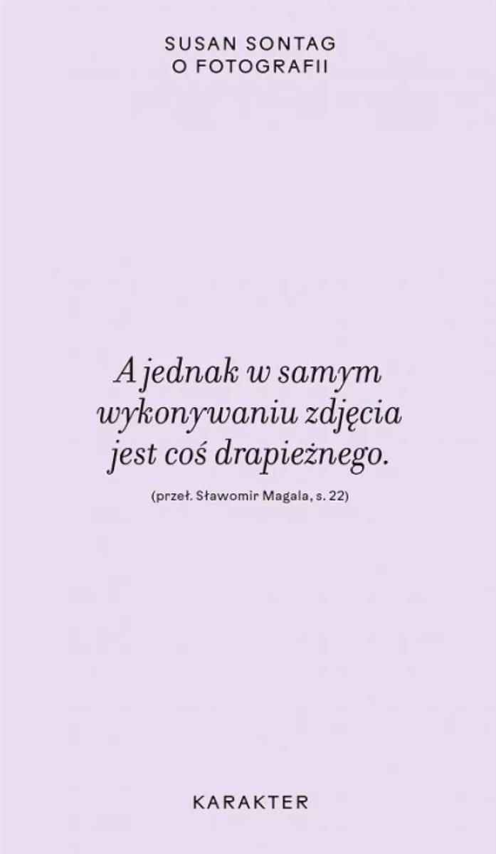 Nowe wydanie najważniejszej w historii książki poświęconej fotografii. Wybitna amerykańska intelektualistka bada znaczenie i funkcję fotografii we współczesnym świecie. Czym w swej istocie jest fotografia? Jakie są jej związki z malarstwem i sztuką? Jak zjawisko fotografii zmieniło nasz sposób postrzegania świata? W jakim stopniu fotografia interpretuje rzeczywistość? Jaka jest relacja między fotografem i obiektem oraz między zdjęciem a patrzącym? Na czym polega współczesny heroizm widzenia? Z jakich powodów sięgamy po aparat fotograficzny? Dlaczego skłonni jesteśmy przechowywać zdjęcia bliskich nam osób?