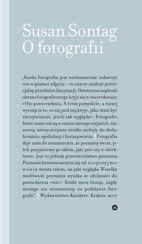 Autorka analizuje prace wybitnych fotografów, przytacza teksty pisarzy i filozofów, ale pisze również o fotografowaniu jako części codziennego życia, swoistym społecznym rytuale,starając się zrozumieć jego funkcję i sens. Głośna książka Susan Sontag to nie tylko zbiór błyskotliwych esejów o fotografii, lecz też pasjonująca, wnikliwa analiza współczesnego świata.