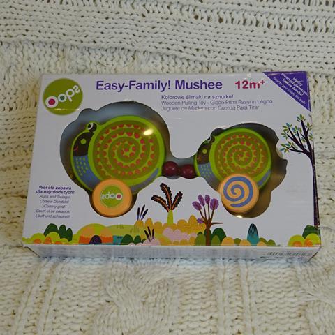 Kolorowe, drewniane ślimaki na sznurku. Idealny towarzysz pierwszych kroków dziecka. Wesoła zabawa dla najmłodszych 12m+.Zabawka nowa, możliwe podniszczone opakowanie.