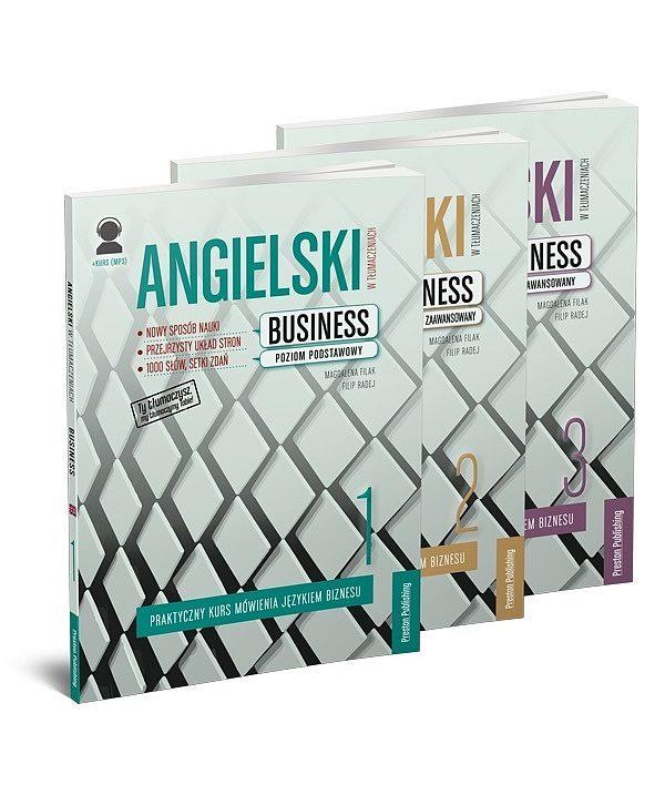 Komplet „Angielski w tłumaczeniach, Business” część 1,2,3 wraz z możliwym do pobrania kursem audio (mp3) to kompleksowe zestawienie słownictwa niezbędnego do swobodnego poruszania się w środowisku biznesowym.Każda z 3 części to ponad 1000 słów oraz 800 zdań do ćwiczenia biznesowego języka angielskiego od poziomu podstawowego do zaawansowanego. Łączy w sobie praktyczne zagadnienia takie jak prowadzenie spotkań, rozmowy telefoniczne, przygotowanie prezentacji, negocjacje, opisywanie wykresów, pisanie e-maili oraz słownictwo tematyczne np. marketing, zarządzanie, reklama, bankowość, księgowość. Dzięki temu w każdej rozmowie będziesz czuł się pewnie i swobodnie.Książki wyróżnia jasny i przejrzysty układ stron, który zmotywuje Cię do nauki. Każdy rozdział to jeden temat związany z biznesem, słownictwo, zdania do tłumaczenia wraz z odpowiedziami oraz ćwiczenia konwersacyjne, dzięki czemu w wyczerpujący sposób wyćwiczysz każde zagadnienie. Dodatkowo obok zdań znajdziesz wskazówki zawierające cenne i przydatne informacje na temat użycia słów, często popełnianych błędów, związków wyrazowych itp.Pakiet zawiera kurs audio (mp3) z ponad 20. godzinami nagrań do ćwiczenia języka w każdej wolnej chwili.Jeśli chcesz nie tylko nauczyć się słownictwa biznesowego, ale także swobodnie używać go i władać językiem w świecie biznesu, ten komplet jest doskonałym wyborem.