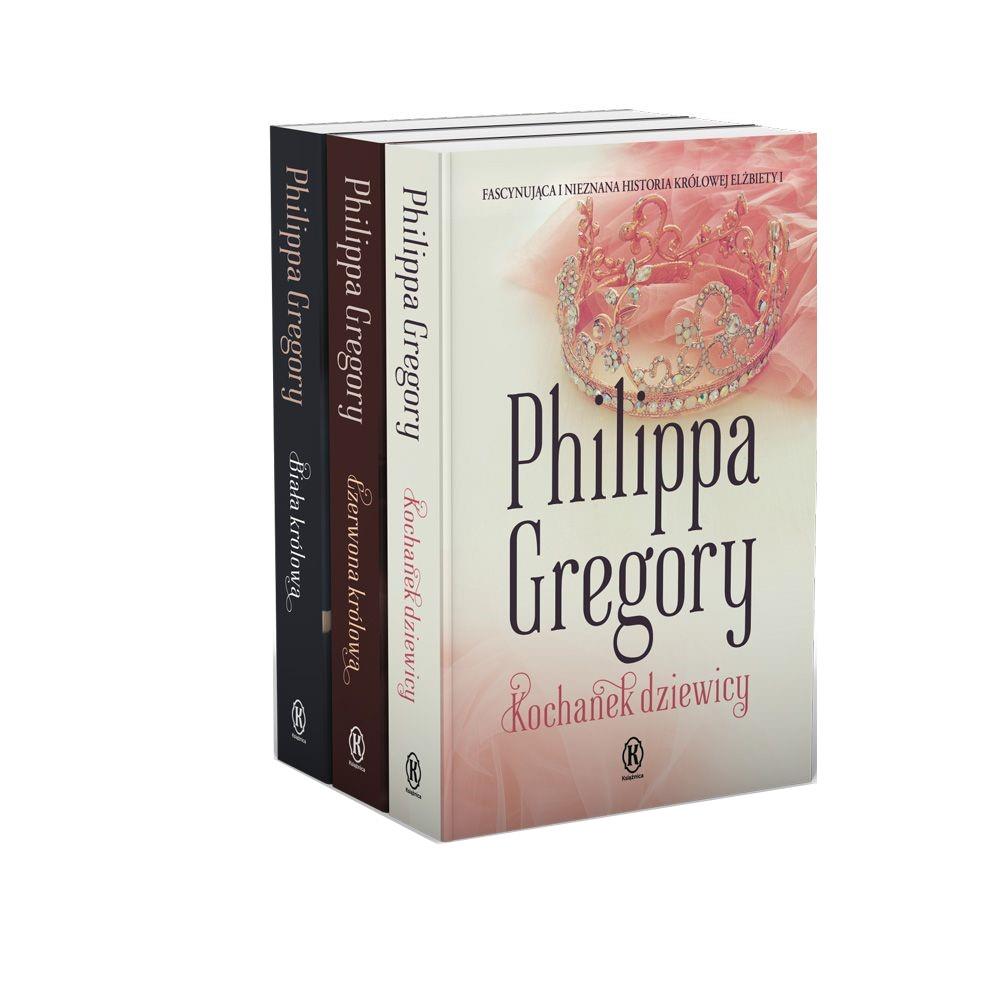 Pakiet zawiera:Biała królowaElżbieta jest kochającą żoną i oparciem dla męża uwikłanego w polityczne rozgrywki. Powoduje nią namiętność, ale i ambicja – zdobywa zaszczyty dla swoich bliskich, za co przyjdzie jej wszakże zapłacić wysoką cenę. W niewyjaśnionych okolicznościach znikają w twierdzy Tower jej dwaj synowie, których losy po dziś dzień stanowią przedmiot spekulacji historyków. Philippa Gregory przedstawia portret zmysłowej kobiety o silnym charakterze, proponując jednocześnie własne, przemawiające do wyobraźni wytłumaczenie zagadki zniknięcia książąt z Tower.Czerwona królowaCzerwona królowa przybliża nieomal zapomnianą historię matki pierwszego władcy z rodu Tudorów, Małgorzaty Beaufort. Poślubiona mężczyźnie dwukrotnie od niej starszemu, urodziła dziecko w wieku lat niespełna czternastu i rychło owdowiała. Zepchnięta na margines postanawia odwrócić kartę losu. Na tronie Anglii chce zobaczyć swego jedynego syna bez względu na to, ile to będzie kosztowało ją, Anglię i nieszczęsnego chłopca. Ignorując pozostałych pretendentów do tronu i rosnących w siłę rywali – Yorków – nadaje synowi imię: Henryk, po królu; wysyła go za granicę na dobrowolne wygnanie; wreszcie zmusza do małżeństwa z najstarszą córką znienawidzonej Elżbiety Woodville. Kochanek dziewicyJako świeżo koronowana królowa Anglii Elżbieta musi stawić czoło dwóm niebezpieczeństwom: francuskiej inwazji na Szkocję, zagrażającej całemu krajowi, oraz swemu uczuciu do Roberta Dudleya, zagrażającemu jej sercu. Robert Dudley jest żonaty, a jego małżonka ani myśli się nim dzielić. Amy Dudley odmawia rozwodu, który Elżbiecie i Robertowi umożliwiłby wzięcie ślubu. Zresztą, przeciwko związkowi królowej z jednym z dworzan są prawie wszyscy. W tle miłosnego trójkąta na dworze Anglii tworzą się frakcje; ktoś przechodzi od słów do czynów. Amy zostaje znaleziona martwa, ze skręconym karkiem, u stóp niewysokich schodów.