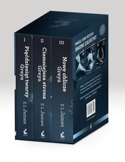 Pięćdziesiąt twarzy GreyaMłoda, niewinna studentka literatury Anastasia Steele jedzie w zastępstwie koleżanki przeprowadzić wywiad dla gazety studenckiej z rekinem biznesu, przystojnym i zamożnym Christianem Greyem. Mężczyzna od pierwszych sekund spotkania fascynuje ją i onieśmiela. W powietrzu wisi coś elektryzującego, czego dziewczyna nie potrafi nazwać, a może tylko się jej wydaje? Z prawdziwą ulgą kończy rozmowę i postanawia zapomnieć o intrygującym przystojniaku. Plan spala jednak na panewce, bo Christian Grey zjawia się nazajutrz w sklepie, w którym Anastasia dorywczo pracuje. Przypadek? I do tego proponuje kolejne spotkanie. W tym miejscu kończy się „disneyowskie" love story, choć młodziutka, niedoświadczona dziewczyna nie wie jeszcze, że Christian opętany jest potrzebą sprawowania nad wszystkim kontroli i że pragnie jej na własnych, dość niezwykłych warunkach... Czy dziewczyna podpisze tajemniczą umowę, której warunki napawają ją strachem i fascynacją? Jaki sekret skrywa przeszłość Christiana i jak wielką władzę mają drzemiące w nim demony?Ciemniejsza strona GreyaDrugi tom bestsellerowej serii. Młodziutką studentkę i charyzmatycznego miliardera połączył nietypowy, silnie uzależniający układ. Demony czające się w duszy Greya dały o sobie znać ze zdwojoną mocą. Przestraszona Ana zerwała związek i zajęła się karierą w wydawnictwie w Seattle. Jednak okazuje się, że rozstanie jest zbyt bolesne. Dręczeni tęsknotą kochankowie przekonują się, że nie potrafią bez siebie żyć. Kiedy Christian proponuje dziewczynie zupełnie nowy układ, ona nie jest w stanie mu odmówić. Wkrótce zaczynają od nowa uczyć się siebie nawzajem. Christian walczy z przymusem kontrolowania innych ludzi. Ana przyzwyczaja się życia w luksusie i bronienia własnej niezależności. Kiedy wydaje się, że świat miłości, pasji i nieskończonych możliwości stoi przed nimi otworem, ciemne chmury gromadzą się nad luksusowym wieżowcem, w którym mieszkają...Nowe oblicze GreyaIch przypadkowe spotkanie dało początek fali namiętności, która z czasem wcale nie osłabła. Wspólna codzienność okazała się nie lada wyzwaniem, któremu Anastasia i Chrstian dzielnie stawiają czoła w imię łączącego ich uczucia. Kochankowie wciąż dryfują po wzburzonym morzu uczuć, targani namiętnością i rozterkami, niepewni tego, co zgotuje im los. Czy najbardziej poruszająca historia miłosna tego roku zakończy się happy endem? A może piękny sen przerwie były szef Any, Jack Hyde, który poprzysiągł zemsty i cierpliwie czeka na swoją szansę?
