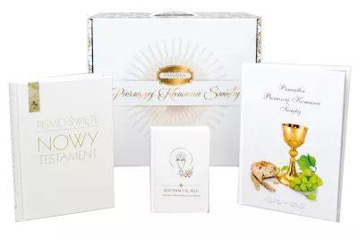 Zestawy komunijne przygotowane specjalnie na uroczystość I Komunii Świętej. ? Chrześijańska pamiątka tego wyjątkowego wydarzenia w życiu dziecka. ? Pięknie wydane, wartościowe książki wraz z modlitewnikiem przypomną niezwykłe chwile związane z uroczystością. ? Eleganckie opakowanie stanowiące gotowy prezent. W zestawie znajdują się: ? Pismo Święte Nowy Testament 14.0 x 20.5 cm, 516 stron, oprawa twarda ? Pamiątka Pierwszej Komunii Świętej 14.5 x 20.5 cm, 24 strony, oprawa twarda, kolorowe zdjęcia ? Kocham Cię, Jezu. Modlitewnik 8.0 x 11.7 cm, 304 strony, oprawa twarda